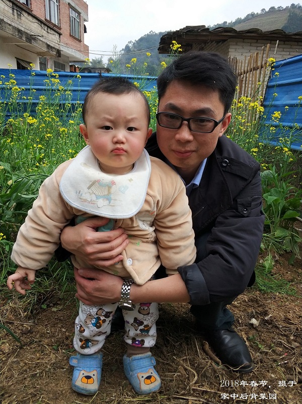 2018年春节,在家后菜园与大锤留念: